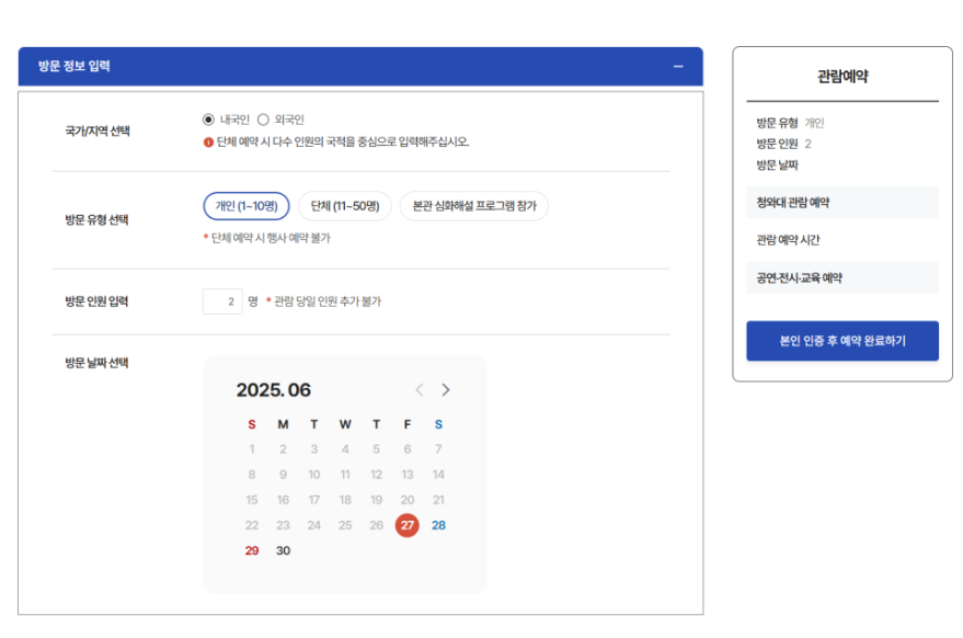 방문일과 인원을 선택한 뒤 예약하면 끝!