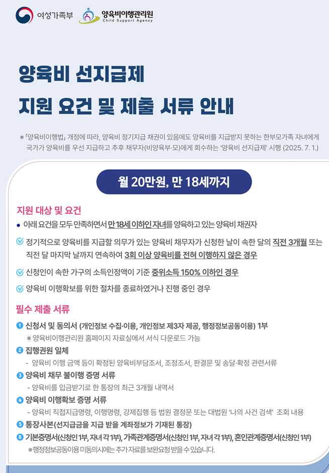 2025년 7월부터 시행되는 이번 제도를 통해 더 이상 양육비 때문에 고통받지 않도록 꼭 신청 자격과 절차를 꼼꼼히 확인해보세요.