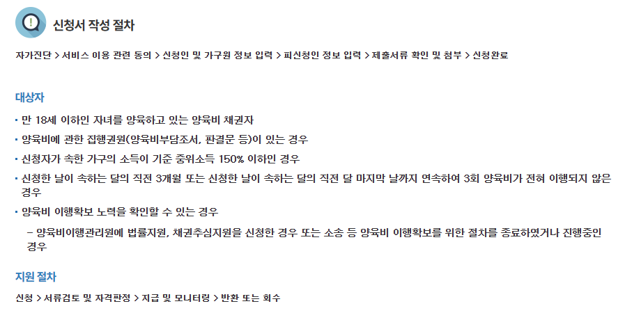 신청은 양육비 이행관리원 홈페이지 또는 가까운 읍·면·동 주민센터에서 가능해 접근성이 좋습니다.